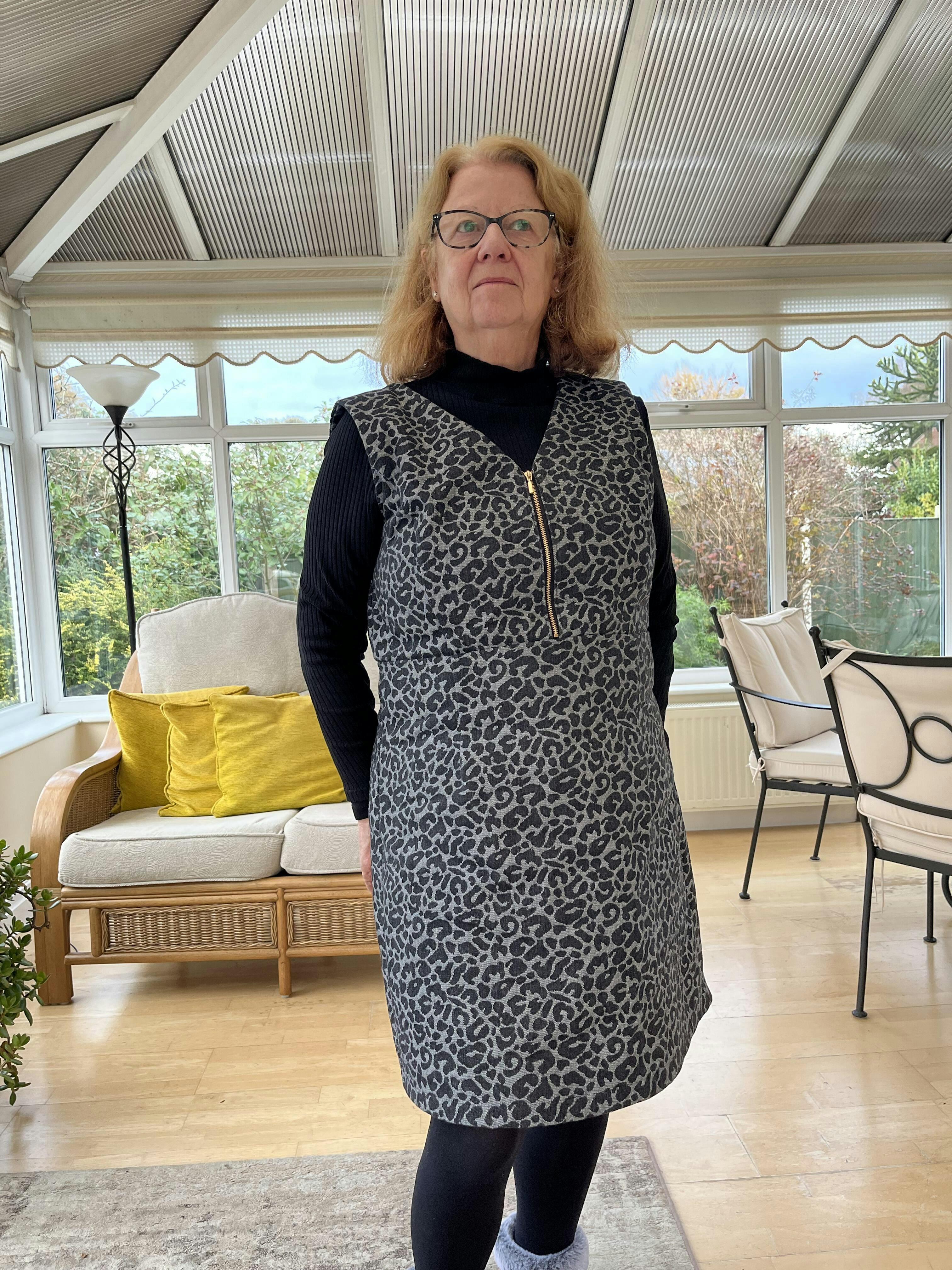 Very pleased with my first Noa Pinafore but for my next one I will go down a size for the neck and armholes. Lovely fit and very comfortable to wear. It is made in Jacquard denim.